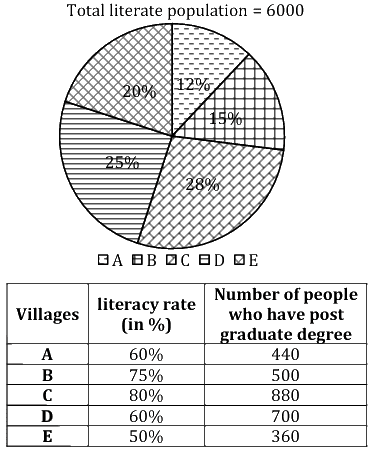 Direction: Given below pie chart shows percentage distribution of total literate people in five different villages and table shows percentage of literacy rate in these five villages out of total population and number of people who have post graduate degree. Read the data carefully and answer the questions.