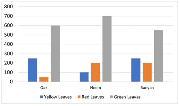 The following bar graph shows the number of different coloured leaves taken for a case study from various trees.