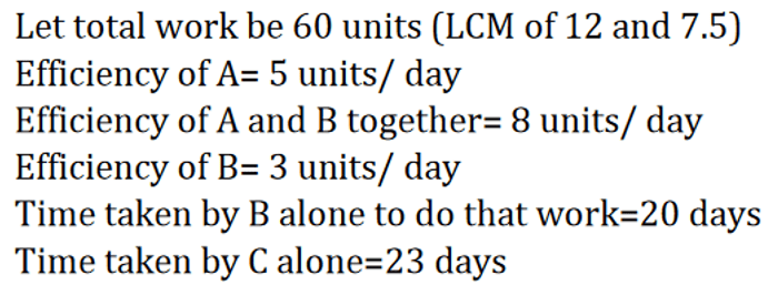 Q. A alone can do a work in 12 days while A and B together can do that work in 7.5 days. Find the time taken by C alone to do that work if C takes 3 days more than that of B alone to do that work?